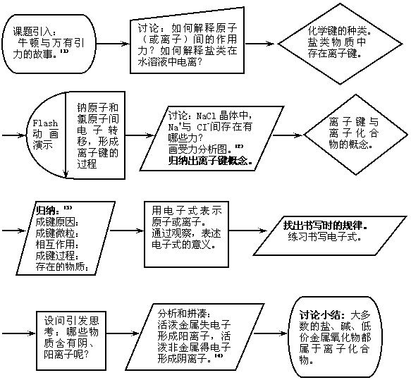 离子键是比较抽象的概念,无法用直观的观察和实验获得感性认识,因此对学生的思维提出较高的要求,需要通过讨论、归纳,将新知识与已有知识联系起来,在头脑中形成清析的印象,完善知识体系。幸而,多媒体技术在教授抽象知识的过程中,起到较好的效果,可以运用动画模拟、用图示辅助学习,在教学过程中适当运用多媒体会起到事半功倍的效果。