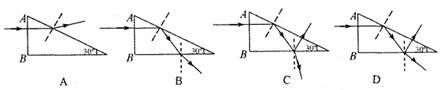 福建省龙岩二中2010届高三摸底考试如图所示,一束光从空气垂直射到直角棱镜的AB面上,已知棱镜材料的折射率为1.4,则这束光进入棱镜后的光路图应为下面四个图中的 ( D )