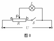 在图8的电路中,R是阻值为“0~15Ω”,额定电流为2A的滑动变阻器,L是一个“12V、24W”的灯泡,电路两端电压保持恒定。当电键S断开,且滑动变阻器Pa部分电阻为4Ω时,灯泡正常发光,则电路两端电压U= ________V。当滑动变阻器Pa部分电阻为9Ω时,电建S闭合后,流过灯泡的电流为___________________A