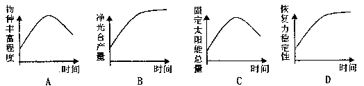 12.一块弃耕的农田,很快长满杂草,几年后,草本植物开始减少,各种灌木却繁茂起来,最后这块农田演变成了一片森林。这片森林在不受外力干扰的情况下将会长期占据那里,成为一个非常稳定的生态系统。该生态系统在此演变过程中,相关变化趋势正确的是