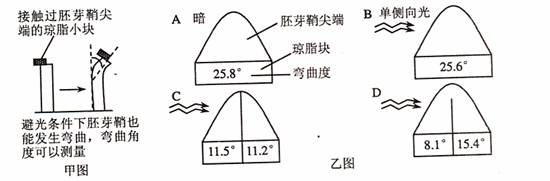 (1)A在暗中,离体玉米胚芽鞘尖端中的生长素扩散进入琼脂块,琼脂块中生长素的含量以琼脂块引起燕麦胚芽鞘的 表示,如甲图。