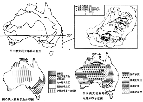 (1)读图甲说明澳大利亚年降水量的空间分布规律?分析甲图A、B两地年降水量差异的主要原因?(6分)