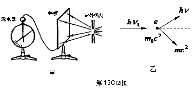 (2)光电效应实验和康普顿实验都证明了光具有 ▲ (填“粒子性”或“波动性”)。甲图中金属片张开是因为验电器带 ▲ (填“正”或“负”)电,若改用强度较弱的紫外线照射锌板 ▲ (填“能”或“不能”)使