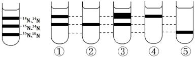 细菌在15N培养基中繁殖数代后,使细菌DNA的含氮碱基皆含有15N,然后再移入14N培养基中培养,抽取亲代及子代的DNA经高速离心分离,下图①-⑤为可能的结果,下列叙述错误的是