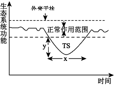 如图所示,两条虚线之间的部分表示生态系统功能正常的作用范围。y表示一个外来干扰使之偏离这一范围的大小;x表示恢复到原状态所需的时间;曲线与正常范围之间所夹的面积可以作为总稳定性的定量指标(TS)。下列说法正确的是