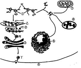28.(8分)下图表示细胞内蛋白质合成及其去向。其中①-⑦表示细胞结构,甲-丁表示结构中的物质。请据图回答: