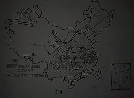 图8为“我国油菜分布及开花日期等值线图”。读图回答13-14题。![]()
