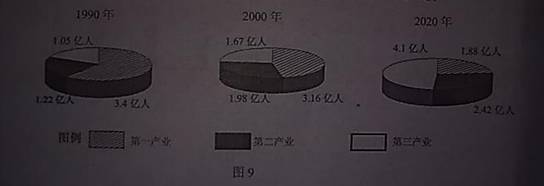 图9为“1990-2020年我国就业结构变化趋势图”。读图回答15题。![]()