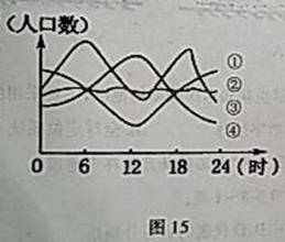 24.图15中的四条曲线,能正确表示城市中心商务区和住宅区人口数量一日变化特点的是