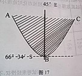27.图17中弧线ABC为晨昏线的一段,阴影部分为黑夜。图18为地球极地俯视图。读图回答下列问题。(11分)