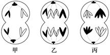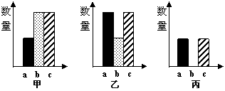 19. 下图中的甲、乙、丙表示动物细胞有丝分裂中的三个阶段,a是染色体数、b是染色单体数、c是DNA分子数,a、b、c的数量关系正确的是( )