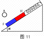 (2010届浙江省永嘉高三期中)如图11所示,条形磁铁放在光滑的斜面上(斜面固定不动),用平行于斜面的轻弹簧拉住而平衡,A为水平放置的直导线的截面,导线中无电流时,磁铁对斜面的压力为F1;导线中有电流时,磁铁对斜面的压力为F2,此时弹簧的伸长量减小。则 ( )