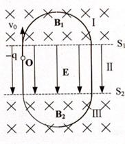 34.如图所示,两个界面S1和S2互相平行,间距为d,将空间分为三个区域。I和III两区域内有方向指向纸内的匀强磁场,磁感应强度分别为B1和B2。区域II内是匀强电场E,方向从S1垂直指向S2。一质量为m、电量为-q的粒子(重力不计)以平行于电场线的初速度v0,从与S1相距为d/4的O点开始运动,为使该粒子沿图中的轨迹(轨迹的两个半圆的半径相等)求:(1)磁感应强度B1:B2之比应是多少;(2)场强E应满足什么条件?