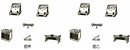 如果待测电阻R的阻值比电压表的内阻不是小很多,但R的阻值比电流表的内阻大很多,试在图甲中连线使之成为测量电路;如果待测电阻R的阻值比电流表的内阻不是大很多,但R的阻值比电压表的内阻小很多,试在图乙中连线使之成为测量电路。