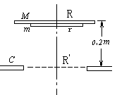 ,两板之间用一根长为0.4米的轻绳相连接。开始时,两板水平放置并叠合在一起,在其正下方0.2米处有一固定支架C,支架上有一半径为R’( r< R’<R)的圆孔, 圆孔与两薄板的中心均在同一竖直线上,如图所示,让两个圆形薄板自由落下,落到固定支架上,大板与支架发生没有机械能损失的碰撞,碰撞后两板即分离,直到轻绳绷紧,在轻绳绷紧瞬间,两薄板具有共同速度vp,若M=m,则vp多大?