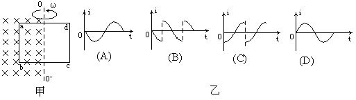 如图(甲)所示,单匝矩形线圈的一半放在具有理想边界的匀强磁场中,线圈轴线OO’与磁场边界重合。线圈按图示方向匀速转动。若从图示位置开始计时,并规定电流方向沿a→b→c→d→a为正方向,则线圈内感应电流随时间变化的图像是下图(乙)中的哪一个?