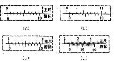如图所示,有四把游标卡尺,读出游标处于图示位置时的读数。