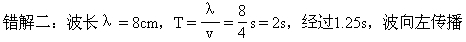 错解一、错解二没有重视单位的一致性,在此题中波长从图中只能得出λ=8cm,而波速给出的却是国际单位4m/s。因此,求周期时,应先将波长的单位统一到国际单位制上来。