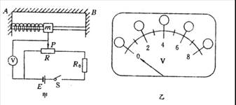18.(10分)“加速度计”作为测定运动物体加速度的仪器,已被广泛应用,图甲所示为应变式加速度计的原理图:支架AB固定在待测系统上,滑块穿在AB之间的水平光滑杆上,并用轻弹簧连接在A端,其下端有一活动臂可在滑动变阻器上自由滑动.随着系统沿水平方向做变速运动,滑块相对于支架将发生位移,并通过电路转换成电信号从电压表输出.已知电压表量程为8V,滑块质量m=0.1kg,弹簧劲度系数k=20N/m,电源电动势E=10V,内阻不计,滑动变阻器总电阻值R=40Ω,有效总长度l=8cm.当待测系统静上时,滑动触头P位于变阻器R的中点,取A→B方向为速度正方向.