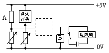 如图所示是为汽车发动机的冷却风扇设计的一个控制电路。要求发动机的点火开关开启,并且温度过高时热敏电阻A阻值变小,B部分就会使得风扇自动开启。以下判断正确的是