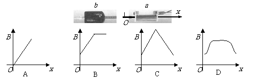 如下图所示,a是长直密绕通电螺线管,应用DIS的磁传感器b沿a的轴线Ox从O点自左向右匀速穿过通电螺线管螺管a。能正确反映通电螺线管内部磁感应强度B随x变化规律的是:
