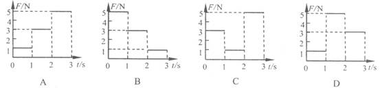 5.将质量为m=lkg的物体静止放在水平面上,物体与水平面之间的动摩擦因数为μ=0.2.现对 物体施加一个方向不变的水平力F,其大小变化如下图所示,在3秒之内物体位移最大的力 图是