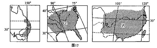 图17中甲、乙、丙三个阴影区域的气候类型相同。读图回答下列问题。