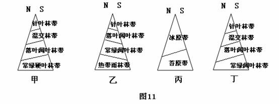 38.图11是某四座山垂直自然带分布示意图,读图回答下列问题。(8分)