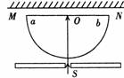 9. 如图所示,MN是位于竖直平面内的光屏,放在水平面上的半圆柱形玻璃砖的平面部分ab与屏平行.由光源S发出的一束白光从半圆沿半径射入玻璃砖,通过圆心O再射到屏上. 在水平面内以O点为圆心沿逆时针方向缓缓转动玻璃砖,在光屏上出现了彩色光带. 当玻璃砖转动角度大于某一值,屏上彩色光带中的某种颜色的色光首先消失. 有关彩色的排列顺序和最先消失的色光是( )