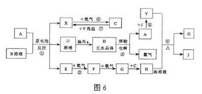 22.(8分)已知A为中学化学中的常见金属,X、Y为常见非金属。X、E、F、G、J常温下为气体,C为无色液体,B是一种盐,受热易分解。现用A与石墨作电极,B的浓溶液作电解质,构成原电池。有关物质之间的转化关系如图6(部分反应的条件、生成物被略去):