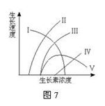图7中曲线Ⅲ表示茎伸长生长与植物生长素浓度的关系。如果同样范围的植物生长素施用于侧芽,则能代表生长状况的曲线是