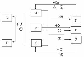 9.(15分)已知A-F是中学化学中常见物质,其中A、C、E为气体,B、D为液体,D的消费量常作为一个国家工业发达水平的一种标志,F的浓溶液与X共热通常用于实验室制备单质C,X是一种黑色粉末,B分子中有18个电子。反应中部分生成物已略去。