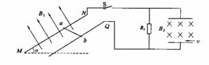 (3)当金属棒稳定下滑时,在水平放置的平行金属间加一垂直于纸面向里的匀强磁场B2=3T,在下板的右端且非常靠近下板的位置有一质量为m2=3×10-4kg、带电量为q=-1×10-4C的液滴以初速度v水平向左射入两板间,该液滴可视为质点。要使带电粒子能从金属板间射出,初速度v应满足什么条件?