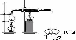 反应一段时间后,有肥皂泡吹起时,用点燃的火柴靠近肥皂当
