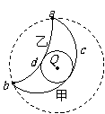 如图所示,虚线表示某点电荷Q所激发电场的等势面,已知a、b两点在同一等势面上, c、d两点在另一个等势面上。甲、乙两个带电粒子以相同的速率,沿不同的方向从同一点a射入电场,在电场中沿不同的轨迹adb曲线、acb曲线运动。则下列说法正确的是