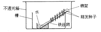 38.如下图显示一研究外界刺激对根生长反应的实验装置,斜置的铁丝网上垫一层棉絮,下端浸入水中。请根据萌发种子所受外界刺激的作用,分析以下哪种情况较可能是其生长状况