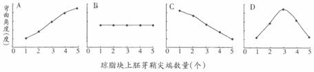 在5个相同的琼脂块上分别放置1-5个水稻胚芽鞘尖端,几小时后将这些琼脂块分别紧贴于5个切去尖端的胚芽鞘切面一侧,经暗培养后,测定胚芽鞘弯曲角度(如右图所示)。正确的结果是( a )