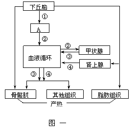 34.(11分)下列图一是人体调节产热的主要途径示意图,图二是有关体温调节的部分神经结构示意图,请据图回答有关问题: