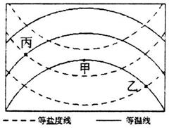 A.乙处的水温低于甲处 B.丙处的盐度低于甲处
