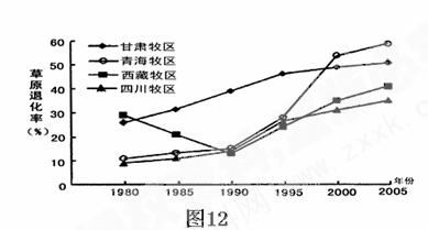 读“我国四个牧区超载起至年份、超载持续时间和年平均超载率表”(表2) 和 “四个牧区草原退化趋势图”(图12),完成25-26题。