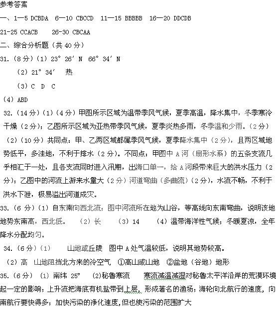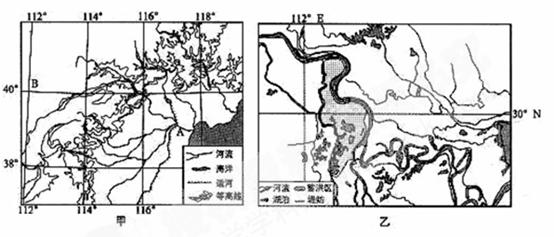 图中的A河段和乙图中所示河段都是洪涝多发之地,试分析导致两区域洪涝多发的共同原因和不同的原因。(10分)