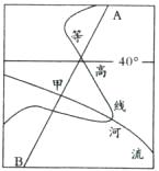 读某区域图,AB为晨昏线,甲地常年受西风带影响,此时甲地刚好看到日落,流经甲地的河流注入某大洋。回答下列问题。(6分)