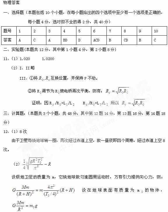 12、有一种卫星叫做极地卫星,其轨道平面与地球的赤道平面成900角,它常应用于遥感、探测。假设有一个极地卫星绕地球做匀速周运动。已知:该卫星的运动周期为T0/4(T0为地球的自转周期),地球表面的重力加速度为g,地球半径为R。则: