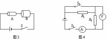 13.现将长度相同、横截面积不同的不同种材料制成的导体A和B接到如图3所示的电路中,闭合电键S,通过A的电流为IA,通过B的电流为IB,则IA___(13)____IB(选填“大于”、“等于”或“小于”),若此时导体A和B两端的电压关系是UA=UB,则RA∶RB是____(14)___,由此可知___(15)____导体的材料导电性能好。(选填“A”或“B”)