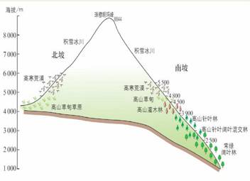 例如:喜马拉雅山,如右图所示,但南坡的自然带更丰富,发育程度更高。