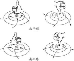 借用物理学中的“左右手定则”判断低气压和高气压的气流运动方向: