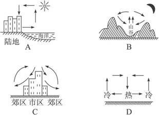 解析:该题综合考查热力环流的形成原理和运用地理知识解决问题的能力。热力环流原理是由于地表冷热不均而形成的。地面受热,空气膨胀上升,地面遇冷,空气冷凝下沉,D项不正确。白天时,陆地升温快,空气上升,海洋上空空气下沉,A项错误。夜晚时,山谷云层厚,保温效应好,气温高,空气上升,B项正确。市区的“城市热岛”效应明显,空气应该呈上升的,C项错误。答案:B