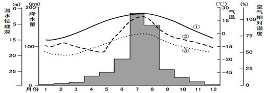 下图是我国某地潜水位埋深与气象要素相关模式图,其中柱子表示月降水量,读图回答18-20题。