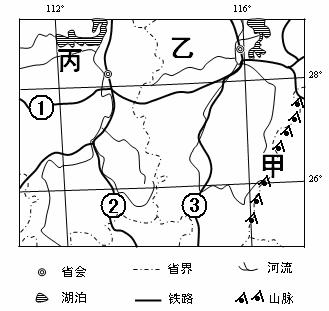 甲(山脉) ;③(铁路) ;铁路①与②的交汇城市 。