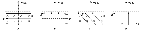 9.如下图所示,两虚线之间的空间内存在着正交或平行的匀强电场E和匀强磁场B,有一个带正电小球(电量为+q,质量为m)从正交或平行的电磁混合场上方的某一高度自由落下,那么,带电小球可能沿直线通过下列的哪个电磁混合场( )